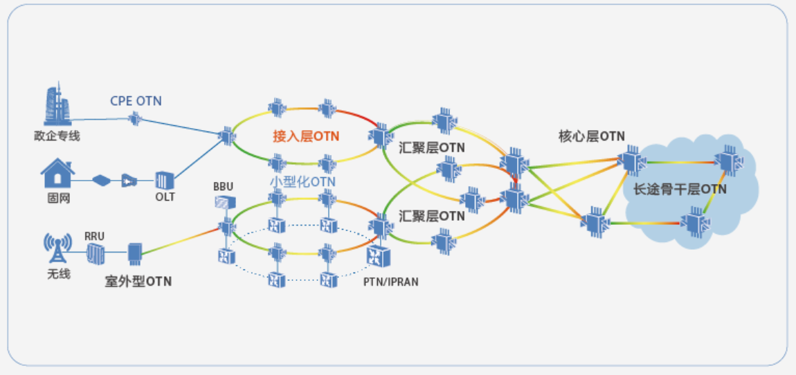 接入層OTN作為OTN網(wǎng)絡(luò)重要的業(yè)務(wù)接入點(diǎn),采用小型化OTN下沉,構(gòu)建超大帶寬、超低時(shí)延、超高可靠、超強(qiáng)適應(yīng)的承載網(wǎng)絡(luò),實(shí)現(xiàn)無(wú)線(xiàn)、固網(wǎng)、專(zhuān)線(xiàn)等上層業(yè)務(wù)的統(tǒng)一高效承載。