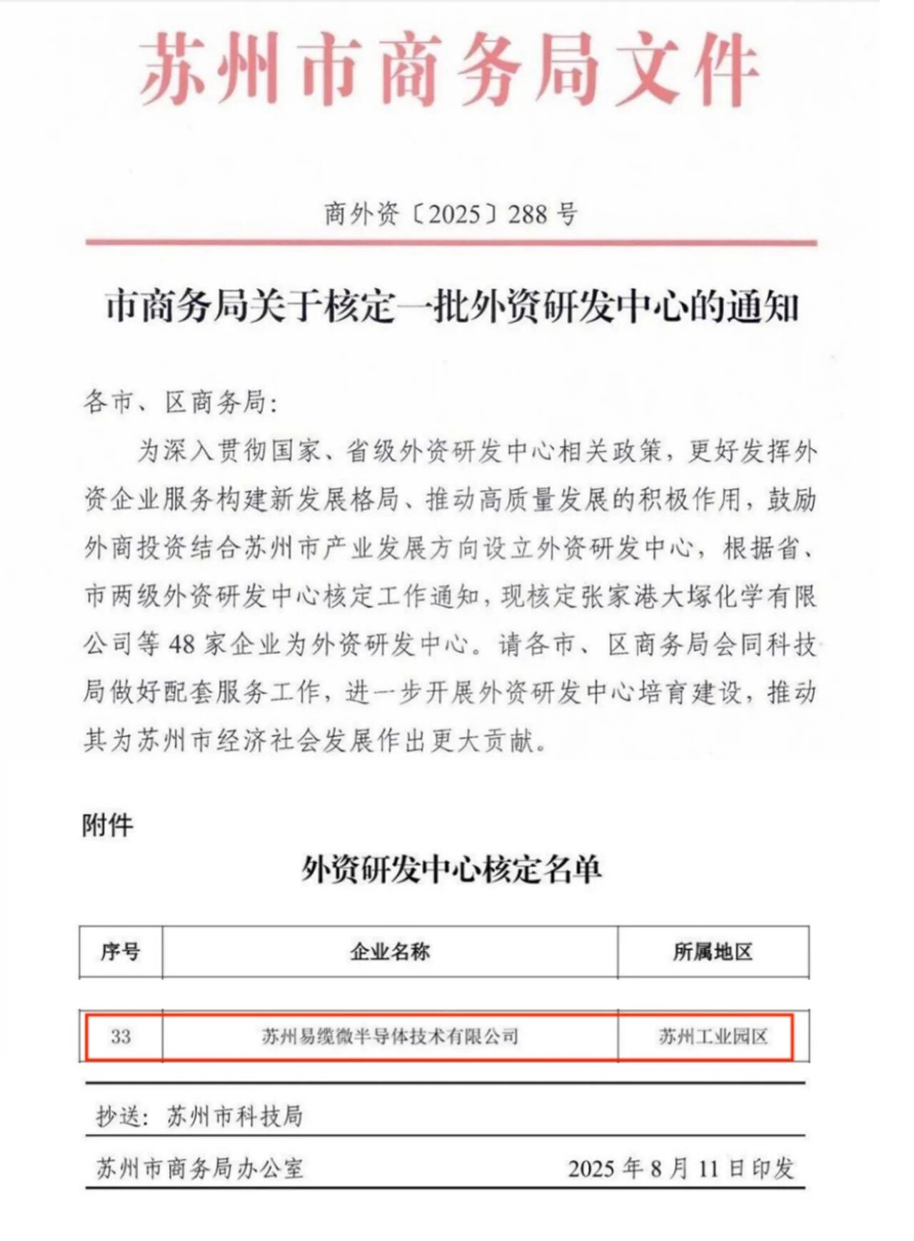 2025年8月11日,蘇州市商務(wù)局、科技局聯(lián)合發(fā)布蘇州市外資研發(fā)中心核定企業(yè)名單,易纜微成功入選,其建立的“蘇州總部—比利時(shí)、廣州研發(fā)中心—常熟中試基地”多點(diǎn)研發(fā)體系獲得官方認(rèn)可。