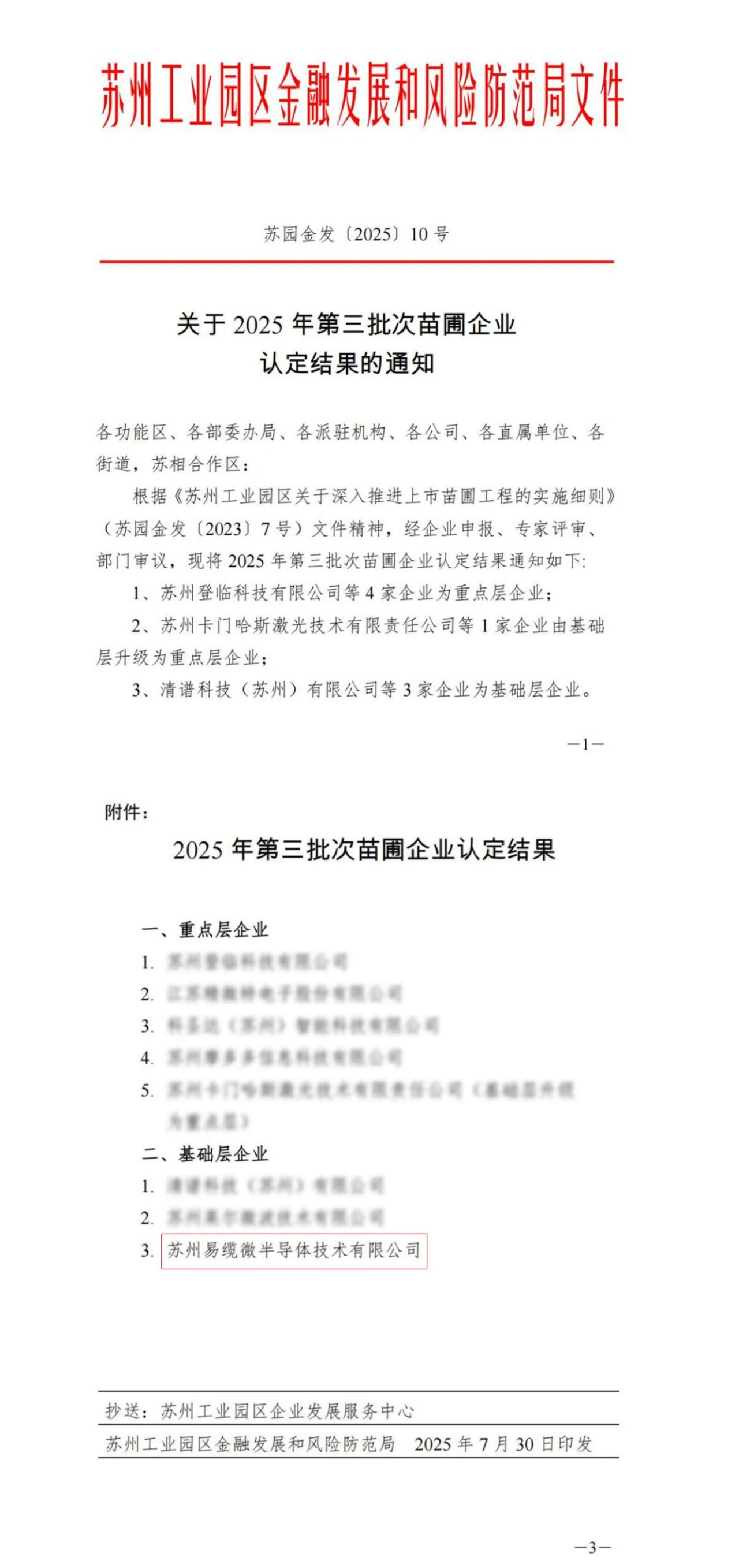 易纜微成功認(rèn)定2025年第三批次蘇州工業(yè)園區(qū)苗圃企業(yè),納入園區(qū)重點(diǎn)培育體系