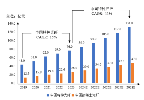 隨著新智造、新基建等新質(zhì)生產(chǎn)力的發(fā)展,我國特種光纖市場需求保持快速增長態(tài)勢,市場規(guī)模不斷擴(kuò)大。相關(guān)數(shù)據(jù)顯示,國內(nèi)特種光纖市場規(guī)模從 2019 年的 43 億元增長至 2023 年的 76 億元,2028 年有望進(jìn)一步攀升至 131 億元。