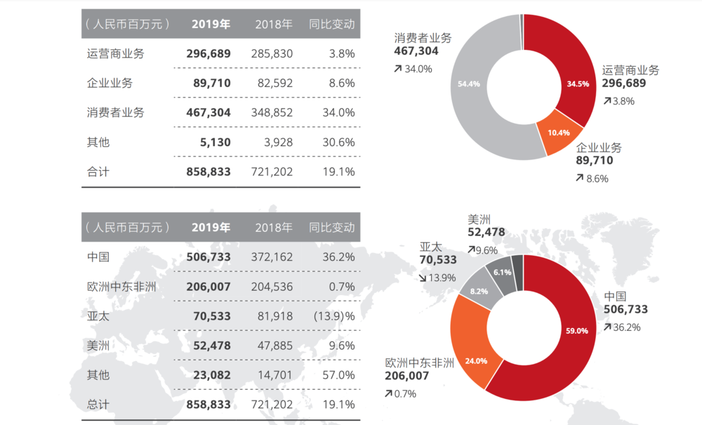 以2019年為例,華為全年銷售收入為人民幣8588億元,同比增長19.1%。在這一年,消費(fèi)者業(yè)務(wù)占總營收比例首次超50%,而2018年以前,運(yùn)營商業(yè)務(wù)才是華為收入占比最高的業(yè)務(wù)。