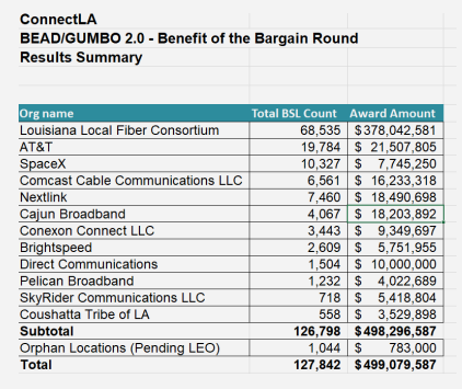 路易斯安那同樣計(jì)劃為約12.7萬寬帶服務(wù)區(qū)域中的80%部署光纖,較最初95%的目標(biāo)略有下調(diào)。值得注意的是,SpaceX星鏈雖獲得770萬美元覆蓋1萬多區(qū)域,但資金額仍低于AT&T和康卡特等有線運(yùn)營商。