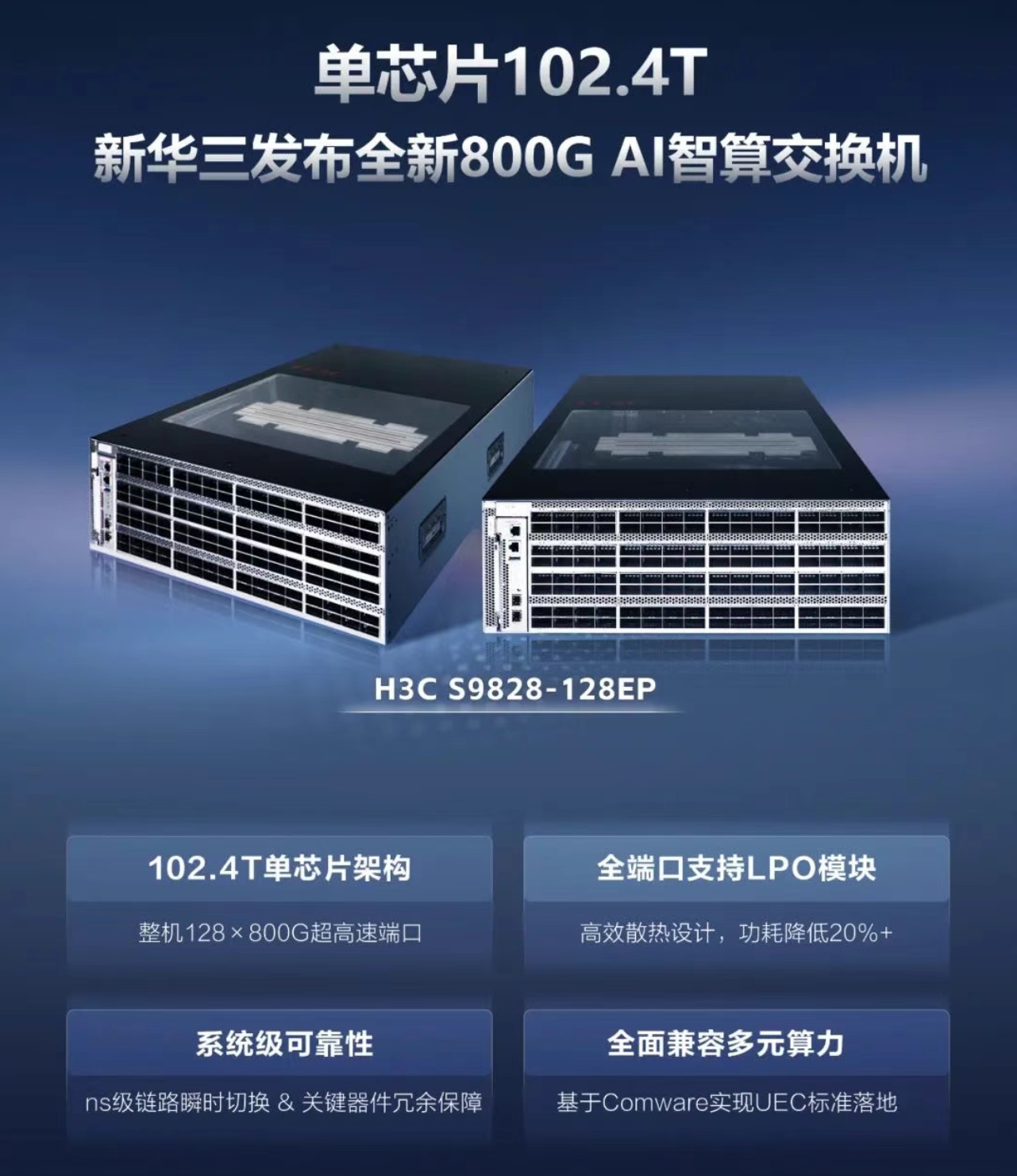 面對這一趨勢,新華三集團(tuán)依托多年在系統(tǒng)設(shè)計、工程實(shí)踐、質(zhì)量流程與先進(jìn)制造上的深厚積累,始終走在智算網(wǎng)絡(luò)技術(shù)產(chǎn)品化的前沿。此次推出的 H3C S9828-128EP,正是這一積淀的集中體現(xiàn)。該產(chǎn)品不僅在端口速率、密度和規(guī)模上實(shí)現(xiàn)突破,更帶來多項(xiàng)工業(yè)級創(chuàng)新,兼容低功耗 LPO/LRO 光模塊,實(shí)現(xiàn)低時延與綠色節(jié)能,在為 AI 訓(xùn)練、科研探索和超大規(guī)模計算場景提供穩(wěn)定高效的網(wǎng)絡(luò)支撐的同時,進(jìn)一步釋放算力潛能,推動產(chǎn)業(yè)邁向新一輪躍升。