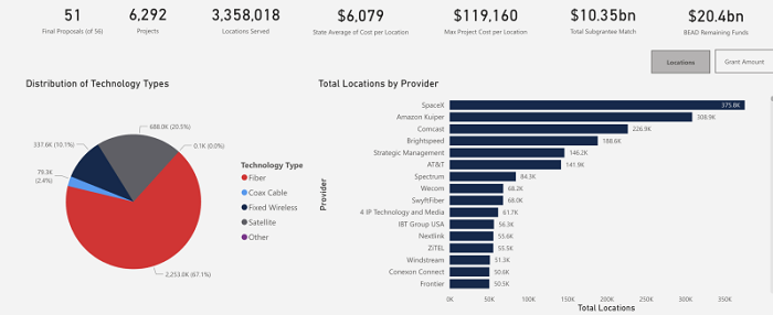 ICC訊 根據(jù)Connected Nation網(wǎng)站對寬帶公平接入與部署(Broadband Equity, Access and Deployment,BEAD)計劃提案的追蹤數(shù)據(jù),在目前已確定的336萬個選址分配方案中,約67.1%將采用光纖連接,20.5%選擇低軌衛(wèi)星連接,剩余部分將采用固定無線接入(10%)和同軸電纜(2.4%)。該數(shù)據(jù)涵蓋56份最終提案中的51份,預(yù)計計劃覆蓋選址總數(shù)達(dá)420萬個。