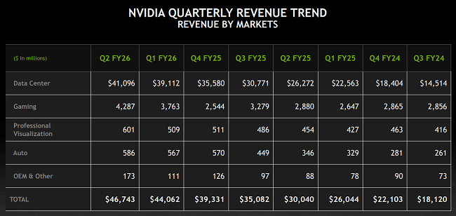 ICC訊 英偉達(dá)(NASDAQ: NVDA)于2025年8月27日公布了截至2025年7月27日的2026財(cái)年第二季度財(cái)務(wù)業(yè)績。該季度收入達(dá)到467億美元,環(huán)比增長6%,同比增長56%。其中,Blackwell數(shù)據(jù)中心收入環(huán)比增長17%。