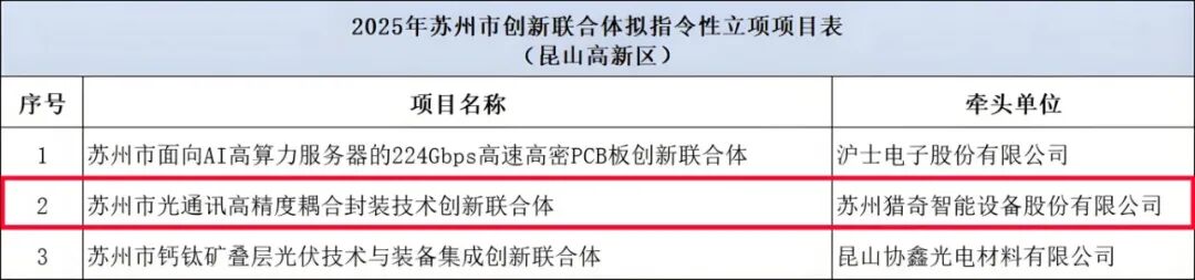 ICC訊 近日,蘇州市科技局對(duì)2025年度蘇州市創(chuàng)新聯(lián)合體立項(xiàng)項(xiàng)目進(jìn)行公示,蘇州獵奇智能設(shè)備股份有限公司成功入選蘇州市創(chuàng)新聯(lián)合體指令性立項(xiàng)項(xiàng)目。