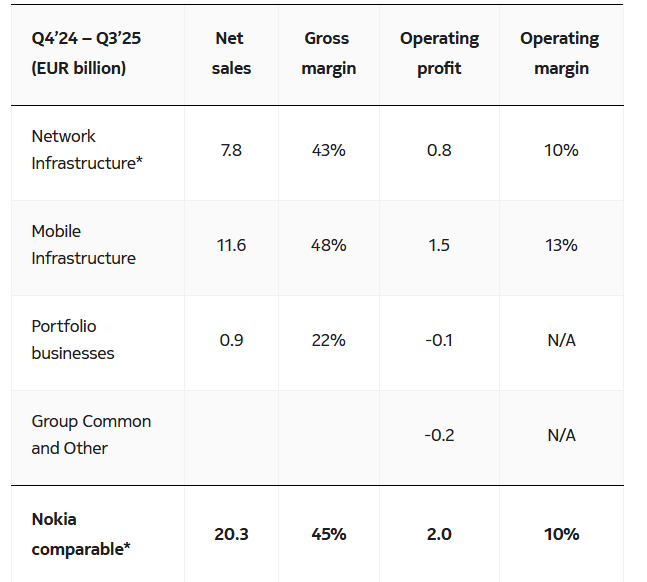 諾基亞正在引入一項(xiàng)新的長(zhǎng)期財(cái)務(wù)目標(biāo):到2028年實(shí)現(xiàn)27億至32億歐元的可比營(yíng)業(yè)利潤(rùn),較過去12個(gè)月(2024年第四季度至2025年第三季度)產(chǎn)生的20億歐元有所提升。這是諾基亞的一項(xiàng)獨(dú)立長(zhǎng)期目標(biāo),不屬于集團(tuán)層面的財(cái)務(wù)展望,并取代了諾基亞此前的長(zhǎng)期目標(biāo)——實(shí)現(xiàn)快于市場(chǎng)的增長(zhǎng)、達(dá)到至少13%的可比營(yíng)業(yè)利潤(rùn)率,以及實(shí)現(xiàn)可比營(yíng)業(yè)利潤(rùn)55%至85%的自由現(xiàn)金流轉(zhuǎn)化率。