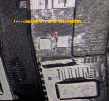 1:工藝要求在兩個(gè)透鏡側(cè)邊點(diǎn)保護(hù)膠對(duì)透鏡進(jìn)行固定保護(hù),透鏡本身較小,不超過(guò)1*0.8mm,兩個(gè)透鏡之間的間距只有約0.5mm,同時(shí)需要點(diǎn)盡可能多的膠以保證透鏡固定強(qiáng)度,同時(shí)側(cè)壁點(diǎn)完膠之后要求不能粘連,因此工藝要求沿著每個(gè)透鏡的邊緣進(jìn)行小于0.25mm的精準(zhǔn)點(diǎn)膠,中間保留一定的間隙。而常規(guī)最小針頭外徑在0.3mm,而噴膠方案存在散點(diǎn)導(dǎo)致產(chǎn)品報(bào)廢風(fēng)險(xiǎn)。