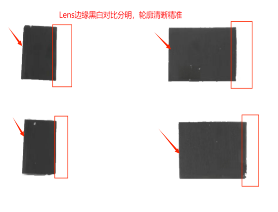 由上圖可見(jiàn),采用后者打光方案可有效規(guī)避產(chǎn)品底部膠水干擾問(wèn)題,且Lens邊界清晰可見(jiàn),實(shí)現(xiàn)精確定位。