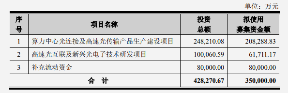 募集資金在扣除發(fā)行費用后,208,288.83萬元將用于算力中心光連接及高速光傳輸產(chǎn)品生產(chǎn)建設(shè)項目,61,711.17萬元用于高速光互聯(lián)及新興光電子技術(shù)研發(fā)項目,80,000萬元用于補充流動資金。公司表示,在募集資金到位前將根據(jù)項目進度以自籌資金先行投入。