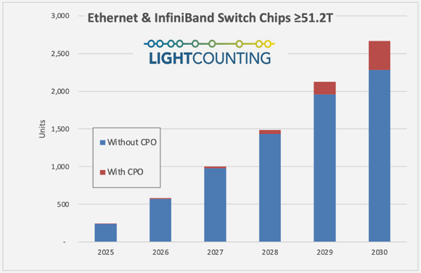 我們預估,包含共封裝光學(Co-packaged Optics,CPO)在內,以太網交換機芯片銷售額在2025至2030年間將以43%的年復合增長率增長。共封裝光學的影響因線性驅動可插拔光學(LPO)為每通道100G光模塊提供相近節(jié)能效果而有所延后。然而目前,每通道200G的共封裝光學交換機即將問世,首款產品為英偉達計劃于2025年下半年推出的InfiniBand共封裝光學交換機,博通TH6-Davisson將于2026年緊隨其后。英偉達的公告提升了我們的近期預測,我們預計至2030年,共封裝光學將為交換機芯片市場帶來約47億美元增量。