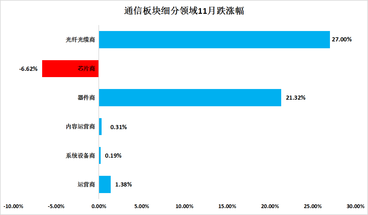 細分領域來看,ICC所統(tǒng)計的互聯(lián)網(wǎng)內容運營商股指為211.1,相比上個月的210.45略微增長。運營商指數(shù)為122.53,10月底股指為120.68,環(huán)比增長1.38%。設備商股指為172.24,與上月相比基本持平。器件商股指為519.95比上月的428.359增長了21.32%。11月幾家國外主要上市公司公布三季度業(yè)績報告,業(yè)績表現(xiàn)亮眼。芯片商股指為1420.09,比上月的1520.8下滑了6.62%。光纖光纜商股指為294.26,相比上月的231.7相比增長27%。