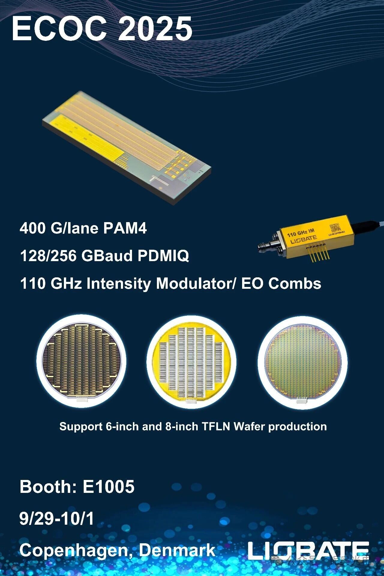 ICC訊 鈮奧光電(Liobate)即將參展ECOC 2025(9月29日- 10月1日,Bella Centre,Copenhagen,Denmark),展會期間將展示最新的薄膜鈮酸鋰(TFLN)芯片與器件:1.6T DR8/ DR4、800G DR8/ DR4芯片,128/256GBaud PDMIQ 芯片,超高帶寬(>130GHz) 芯片,40G/70G IQ調(diào)制器、40G相位調(diào)制器、40G/67G/110G強度調(diào)制器、光頻梳器件等。展位號:#E1005,真誠歡迎各位業(yè)界同仁前來參觀交流。