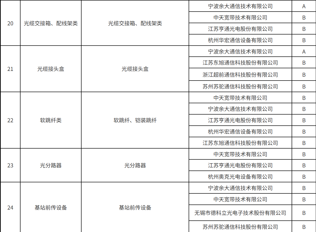 本次公示涵蓋了光纜類、光纖分纖箱/終端盒類、光纜交接箱/配線架類、光纜接頭盒、軟跳纖類、光分路器、數(shù)據(jù)線纜、基站前傳設備、數(shù)據(jù)中心/中低端交換機、智能家庭網(wǎng)關、基站天線類、機柜類等34個產(chǎn)品服務。A、B級供應商名單具體的分級結果如下: