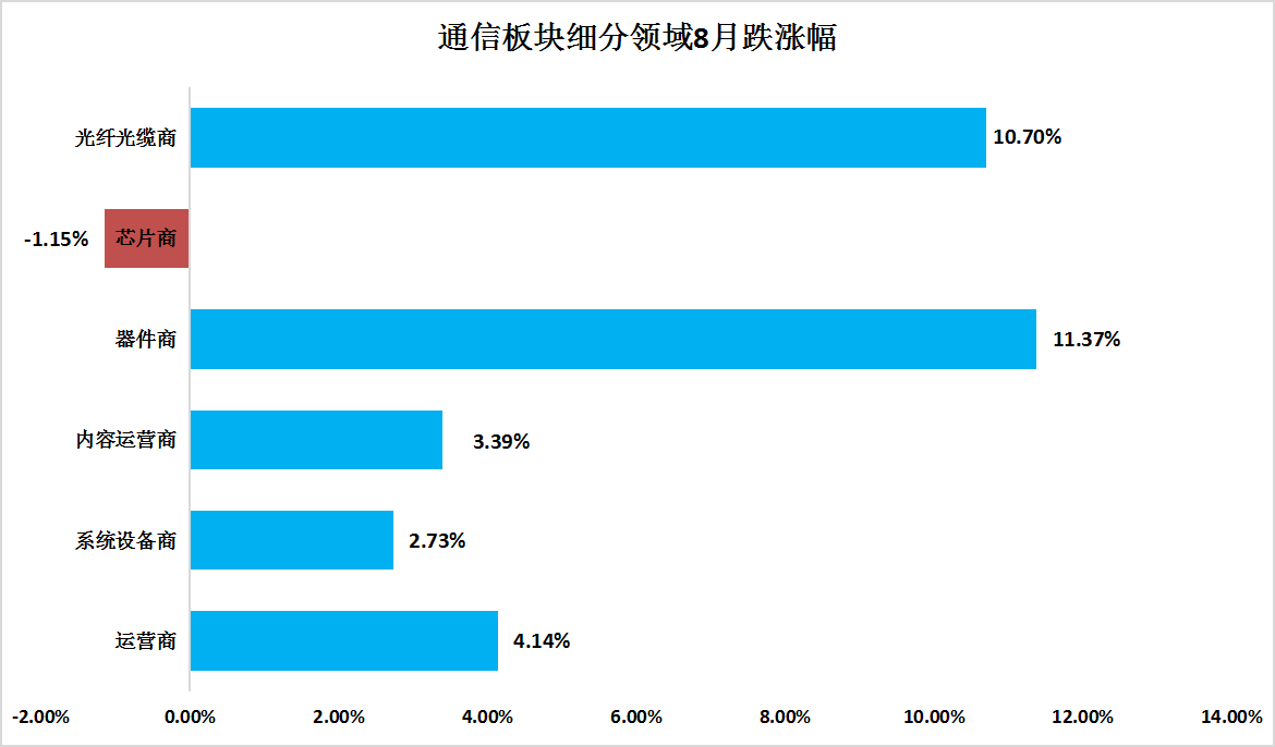 細(xì)分領(lǐng)域來(lái)看,ICC所統(tǒng)計(jì)的互聯(lián)網(wǎng)內(nèi)容運(yùn)營(yíng)商股指為189.5,相比上個(gè)月的183.29增長(zhǎng)了3.39%。國(guó)內(nèi)外云廠商資本開(kāi)支超預(yù)期,算力需求增長(zhǎng)。運(yùn)營(yíng)商指數(shù)為131.39,7月底股指為125.98,環(huán)比增長(zhǎng)4.14%,運(yùn)營(yíng)商傳統(tǒng)移動(dòng)業(yè)務(wù)這增長(zhǎng)放緩。設(shè)備商股指為135.85,相比上個(gè)月的132.24增長(zhǎng)了2.73%。設(shè)備商業(yè)績(jī)持續(xù)增長(zhǎng),積極開(kāi)拓新市場(chǎng)。器件商股指為347.42比上月的311.94增長(zhǎng)了11.37%,國(guó)內(nèi)外主要器件廠商半年度業(yè)績(jī)顯示,受益于AI和算力需求的帶動(dòng),數(shù)據(jù)中心需求增長(zhǎng)強(qiáng)勢(shì),營(yíng)收和利潤(rùn)均實(shí)現(xiàn)大幅度增長(zhǎng)。芯片商股指為1294.71,比上月的1309.76下滑1.15%,光纖光纜商股指為236.67,相比上月的213.79相比增長(zhǎng)了10.7%。