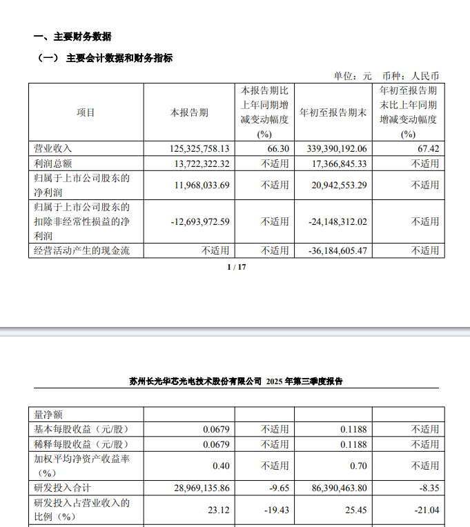 ICC訊 長光華芯披露2025年第三季度報告,公司前三季度實現(xiàn)營收3.39億元,同比增長67.42%;歸母凈利潤2094萬元,同比扭虧為盈。其中第三季度公司實現(xiàn)營收1.25 億元,同比增長 66.3%;實現(xiàn)歸母凈利潤1197萬元,同比扭虧。業(yè)績增長主要是公司市場拓展較好,下游需求開始有所復蘇,公司高功率產品收入增長。此外,公司前期布局的光通信等業(yè)務獲得終端客戶認可并實現(xiàn)批量出貨,有望成為公司第二增長曲線。