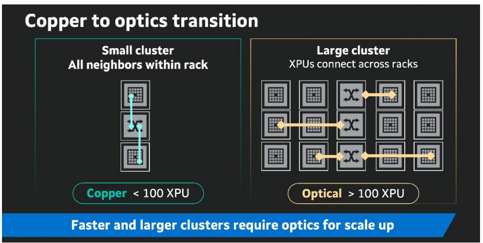 大規(guī)模 scale-up 網絡中銅纜連接有望向光互連轉換(數據來源:Marvell)