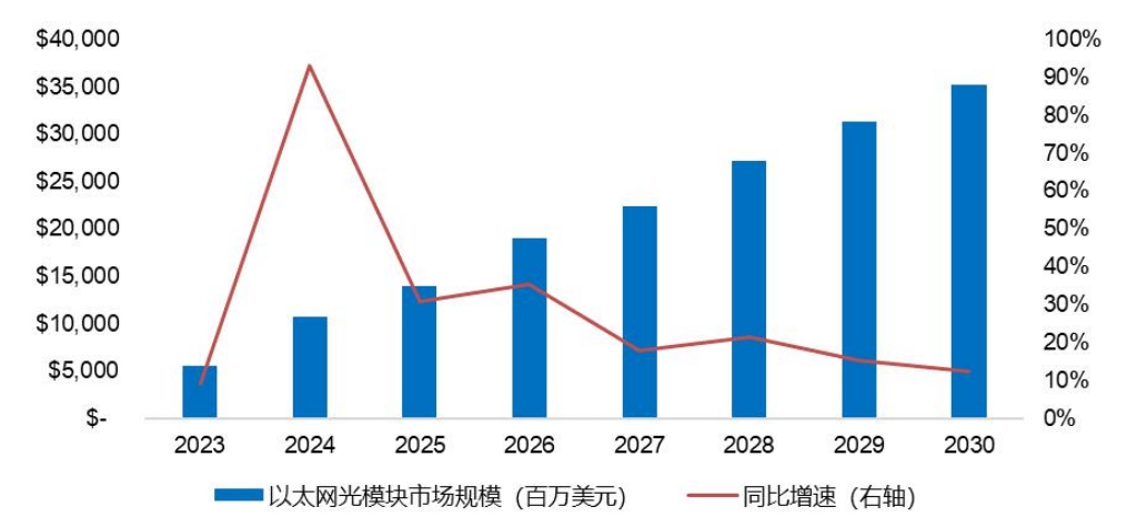 全球以太網光模塊市場規(guī)模及預測(百萬美元)(數據來源:Lightcounting)