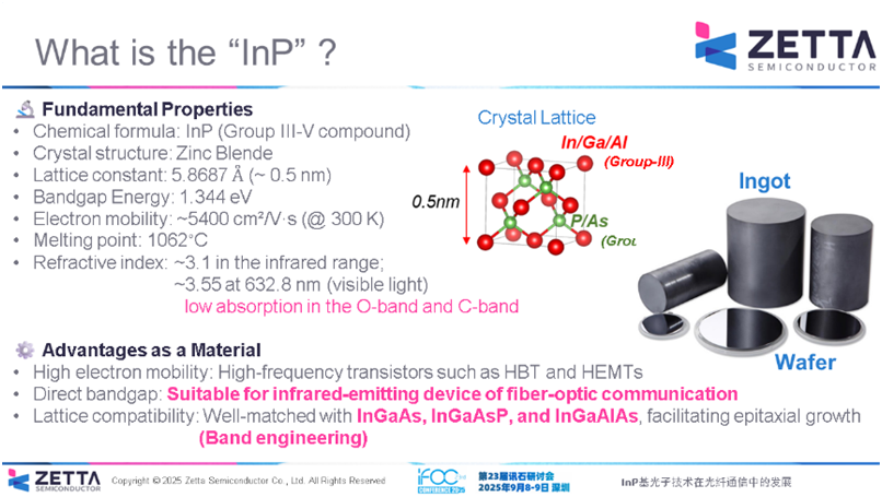 K-H Huang博士回顧了磷化銦基光子學(xué)的發(fā)展起源:1963年光纖通信技術(shù)首次得到驗證,隨后長波長低損耗傳輸技術(shù)及磷化銦基激光器相繼問世。他指出,磷化銦具有直接帶隙、高電子遷移率及出色的晶格匹配度等特性,這些都是有源器件創(chuàng)新的關(guān)鍵要素,且六十多年來其實用性已得到充分驗證。K-H Huang博士強調(diào)了磷化銦基光子學(xué)技術(shù)的延展性,并表示該技術(shù)仍將在單波200Gbps/400Gbps數(shù)據(jù)中心及相干光通信領(lǐng)域的發(fā)展中扮演重要的角色。