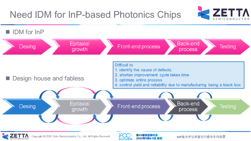 作為國內(nèi)集成器件制造商(IDM),澤達(dá)半導(dǎo)體憑借其在磷化銦(InP)技術(shù)領(lǐng)域的深厚積累,打造了一套從芯片設(shè)計、外延生長、芯片制造到封裝測試的垂直整合生產(chǎn)生態(tài)系統(tǒng)。這種全流程技術(shù)能力,使公司能夠推出多元化的高性能光芯片產(chǎn)品組合,可精準(zhǔn)適配各類應(yīng)用場景。對此,K-H Huang博士表示,自主掌控芯片制造全流程,不僅能確保工藝的穩(wěn)定性與可控性,還能提升產(chǎn)品的可靠性與一致性,這對于為客戶提供長期、穩(wěn)定的供應(yīng)鏈至關(guān)重要。