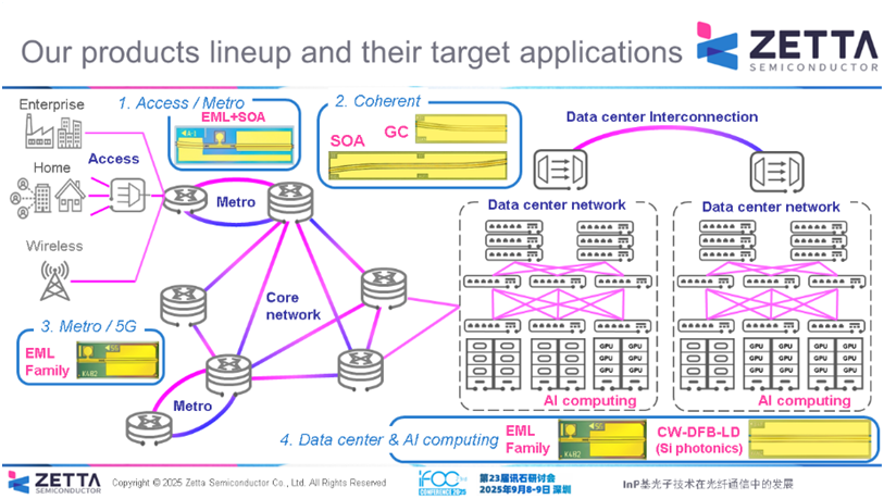 澤達(dá)半導(dǎo)體的核心產(chǎn)品線包括:100Gbps/200Gbps PAM4 電吸收調(diào)制激光器(EML),以及連續(xù)波分布反饋激光器(CW-DFB)、增益芯片Gain chip及半導(dǎo)體光放大芯片SOA。其中,100G PAM4 EML 已進(jìn)入量產(chǎn)階段,主要面向數(shù)據(jù)中心與AI智算;同時,200G PAM4 EML正積極推進(jìn)市場化,以滿足下一代高帶寬應(yīng)用的需求。K-H Huang博士還分享了公司產(chǎn)品及目標(biāo)應(yīng)用場景的深度見解,并著重提及目前正在開展的 EML-SOA 集成技術(shù)與高功率 CW-DFB技術(shù)研發(fā)工作,這些研發(fā)舉措旨在突破當(dāng)前的性能瓶頸,實現(xiàn)高端光芯片國產(chǎn)自主可控。
