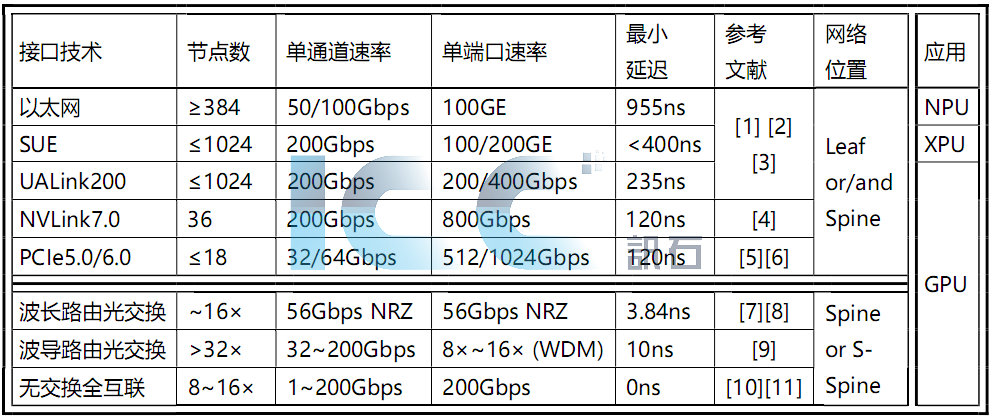 以太網(wǎng)交換是目前最成熟、應(yīng)用范圍最廣的一種網(wǎng)絡(luò)互聯(lián)技術(shù),用以太交換組成算力芯片超節(jié)點(diǎn)的技術(shù)路線具有技術(shù)成熟,易于引入成熟的以太光模塊實(shí)現(xiàn)柜間光互聯(lián),突破電互聯(lián)的單柜限制,降低對(duì)單柜供電散熱的要求,小芯片即可組成大網(wǎng)絡(luò)等優(yōu)點(diǎn)[1]。見表1,博通也推出了SUE(Scale Up Ethernet)方案,并盡力降低標(biāo)準(zhǔn)以太網(wǎng)的延遲[2],這兩種互聯(lián)方案分別針對(duì)NPU/XPU等算力芯片,對(duì)于網(wǎng)絡(luò)性能要求更高的GPU傾向于采用其它更低延遲的技術(shù)方案。