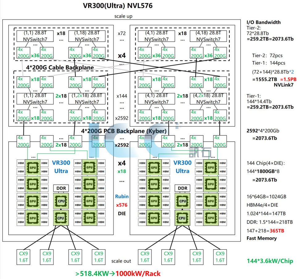 NVLink交換機(jī)以其低延遲、大通道數(shù)、高帶寬(通道數(shù)乘以單通道速率)成為GPU互聯(lián)的領(lǐng)先技術(shù)方案,NVSwitch5.0單通道速率達(dá)到200Gbps,單芯片單向帶寬達(dá)到72*2*200G=28.8Tbps=3600GBps,問題是NVSwitch5.0~7.0單向帶寬都是3600GBps,考慮到下一代GPU Rubin的I/O帶寬達(dá)單向1.8TBps=18*4*200Gbps,造成NVSwitch7.0的端口數(shù)從前兩代的72反而降低到3.6TBps*8/(4*200Gbps)=36,可見單層交換網(wǎng)絡(luò)已觸及網(wǎng)絡(luò)規(guī)模的天花板,難以繼續(xù)滿足大模型對(duì)硬件規(guī)模指數(shù)增長(zhǎng)的要求。下一代GPU集群VR300 NVL576只能撿起NVLink4.0時(shí)代GH200和NVLink5.0時(shí)代GB200 NVL576放棄的兩層交換網(wǎng)絡(luò)來擴(kuò)大網(wǎng)絡(luò)節(jié)點(diǎn)數(shù),為了保證系統(tǒng)的可靠性、成本、總功耗、總成本等指標(biāo),放棄引入前兩代失敗的光互連,光退銅進(jìn),采用正交背板+銅纜的純電互聯(lián),兩層交換芯片的總帶寬達(dá)到恐怖的雙向(72+144)*3.6TBps*2=1.5PB!這還帶來一個(gè)更嚴(yán)重的問題:這個(gè)576卡的超大集群只能塞進(jìn)單柜中,單柜功耗將飆升至接近1000kW[4],這是在挑戰(zhàn)供電、散熱、運(yùn)維等工業(yè)極限,量產(chǎn)難度將遠(yuǎn)超成功的GB300 NVL72產(chǎn)品,那只有120kW單柜功耗,都遇到了各種工藝問題和延期。如圖2,這條技術(shù)路線可能具有更大的不確定性。