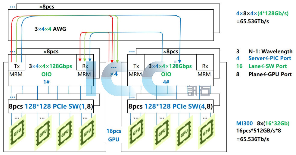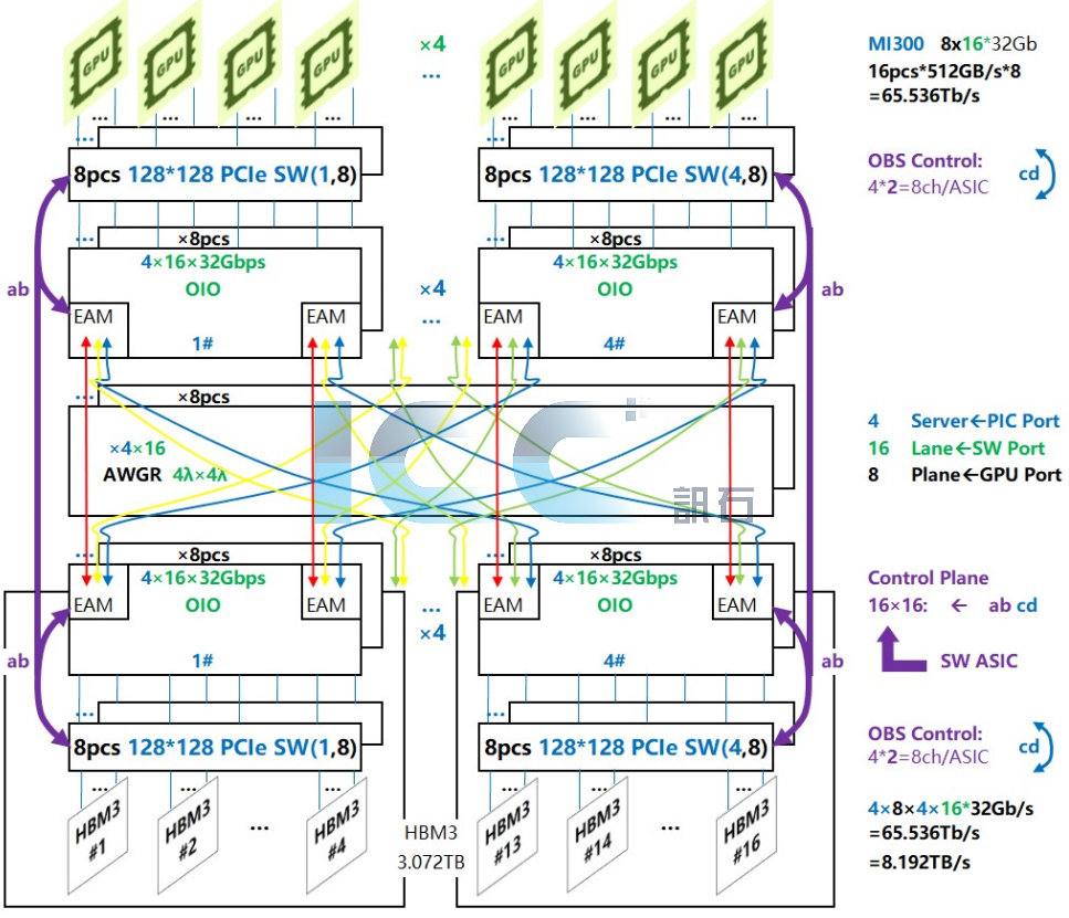 為打破限制PCIe-GPU互聯(lián)的瓶頸,波長(zhǎng)路由光交換獲得重視[7] [8],特別是GPU和顯存池之間全帶寬低延遲多節(jié)點(diǎn)任意互聯(lián),打破存儲(chǔ)墻,成為GPU scale-up互聯(lián)的另外一種更為直接的技術(shù)路線。圖4是最小規(guī)模的波長(zhǎng)路由交換系統(tǒng),采用16顆AMD上一代GPU MI300,16節(jié)點(diǎn)HBM3顆粒組成顯存池,他們之間全帶寬任意互聯(lián)16pcs* 512GBps*8=65.536Tbps,由兩跳Leaf層PCIe交換芯片加一跳Spine層波長(zhǎng)路由光交換完成。完成波長(zhǎng)路由交換(4x4)的是陣列波導(dǎo)光柵路由選擇器AWGR,但是完成納秒級(jí)波長(zhǎng)切換的是4波光源,其控制信號(hào)(圖中ab)來自Leaf層交換芯片,所以從電域看來,這根本不是光包交換OPS,和波導(dǎo)路由光交換一樣,本質(zhì)上都是控制面和數(shù)據(jù)面分離的光突發(fā)交換OBS[9],雖然一般認(rèn)為這是目前唯一可實(shí)現(xiàn)的光包交換OPS,因?yàn)閺墓庥蚩磥?,承載目標(biāo)地址的光標(biāo)記信息可以加載到光波長(zhǎng)上避免與數(shù)據(jù)面分離。