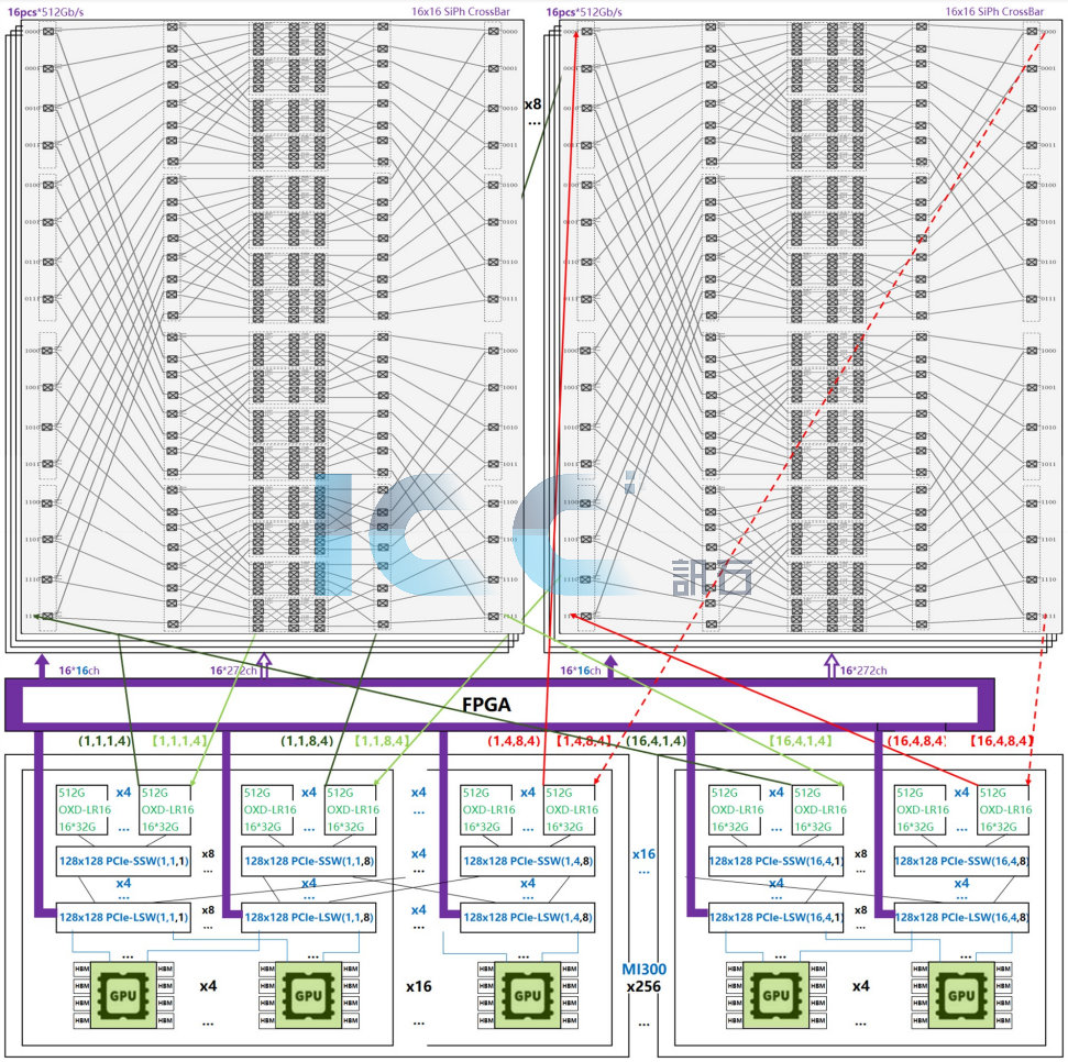 圖5還是采用和圖4一樣的AMD MI300 GPU和帶OBS控制輸出的128x128 PCIe5.0 Switch,雖然通道數(shù)達(dá)128,可是端口數(shù)只有8個(gè),一般認(rèn)為這限制了PCIe 交換網(wǎng)絡(luò)的可擴(kuò)展性,引入波長(zhǎng)路由光交換后的網(wǎng)絡(luò)可擴(kuò)展性也有限。但是引入了Spine層波導(dǎo)路由光交換就完全不一樣了,比圖4的網(wǎng)絡(luò)規(guī)模更大,供應(yīng)鏈更成熟。這個(gè)系統(tǒng)的關(guān)鍵指標(biāo)可以跨代碾壓成功的GB300 NVL72產(chǎn)品:2倍的總帶寬256*1024GBps=260TBps,2.4倍的顯存256*192GB=49TB,節(jié)點(diǎn)數(shù)更是高達(dá)256,還可以分散到多達(dá)16柜;柜間光互連使高單柜供電散熱難題消失;也沒必要采用1.6T/3.2T/CPO等高密度光電轉(zhuǎn)換,采用普通的成熟工藝光模塊性價(jià)比可能更高。