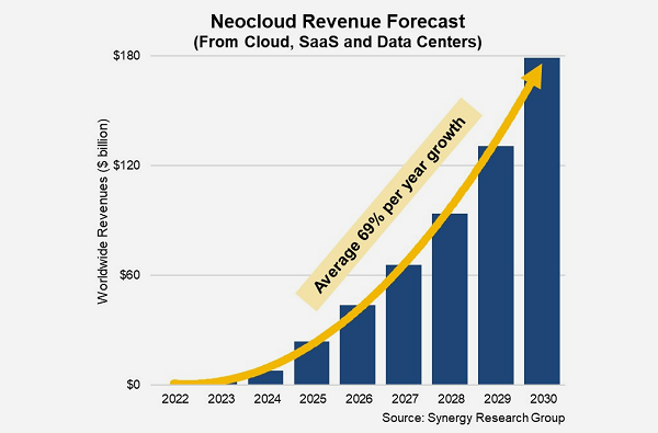 ICC訊 Synergy研究集團的新數(shù)據(jù)顯示,新云(Neocloud)收入在2025年第二季度已突破50億美元大關,較去年增長205%。預計全年收入將超過230億美元。Synergy預測,到2030年,新云收入將達近1800億美元,年均增長率為69%。