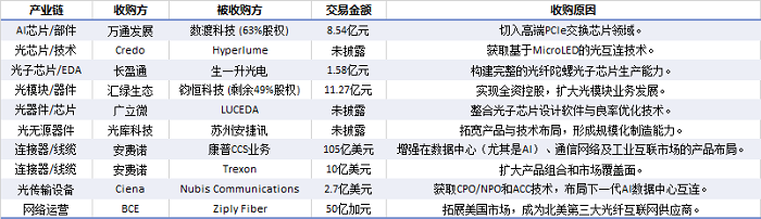 本輪增長紅利已惠及全產(chǎn)業(yè)鏈。報告覆蓋的芯片商、設備商及光纖光纜商營收均預計實現(xiàn)兩位數(shù)同比增長。為搶占技術(shù)制高點,產(chǎn)業(yè)并購異?;钴S,如Credo收購Hyperlume獲取光互連技術(shù)、Ciena收購Nubis布局CPO等,表明巨頭正通過資本手段快速整合下一代核心技術(shù)。
