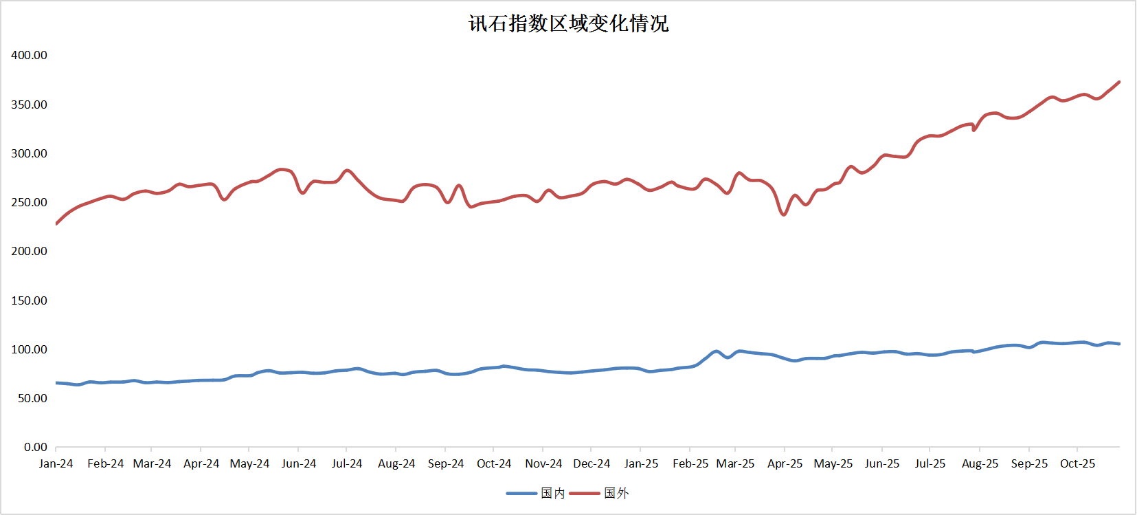 按地區(qū)劃分,截止到10月31日,ICC所統(tǒng)計(jì)的國(guó)內(nèi)通信指數(shù)為105.17,環(huán)比略微下滑。國(guó)外通信指數(shù)為372.59,較上月增長(zhǎng)5.45%。國(guó)外股指在波折中,呈現(xiàn)向上增長(zhǎng)的趨勢(shì)。