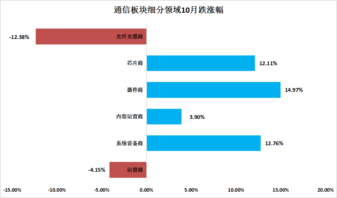細(xì)分領(lǐng)域來(lái)看,ICC所統(tǒng)計(jì)的互聯(lián)網(wǎng)內(nèi)容運(yùn)營(yíng)商股指為210.45,相比上個(gè)月的202.56增長(zhǎng)了3.9%。得益于AI與云業(yè)務(wù)的需求增長(zhǎng),海外部分云廠商繼續(xù)上調(diào)了其相關(guān)資本開(kāi)支,加速推進(jìn)AI應(yīng)用。國(guó)內(nèi)方面,以阿里巴巴、騰訊等為代表的國(guó)內(nèi)AI巨頭或進(jìn)入AI算力大規(guī)模投入期。運(yùn)營(yíng)商指數(shù)為120.86,9月底股指為126.09,環(huán)比下滑4.15%。設(shè)備商股指為171.91,相比上個(gè)月的152.45增長(zhǎng)了12.76%。器件商股指為428.59比上月的372.78增長(zhǎng)了14.97%。10月正值上市公司公布三季度業(yè)績(jī)報(bào)告,受益于AI算力的驅(qū)動(dòng)的器件商,業(yè)績(jī)?cè)鲩L(zhǎng)亮眼。尤其是龍頭光模塊企業(yè)。芯片商股指為1520.8,比上月的1356.52增長(zhǎng)12.11%。英偉達(dá)擬出貨2000萬(wàn)Blackwell 芯片,英偉達(dá)預(yù)計(jì),Blackwell和明年推出的Rubin芯片將合計(jì)帶來(lái)五個(gè)季度 5000 億美元的 GPU 銷售額英偉達(dá)芯片需求依然強(qiáng)勁,AI景氣度持續(xù)攀升。光纖光纜商股指為231.7,相比上月的264.44相比下滑了12.38%。
