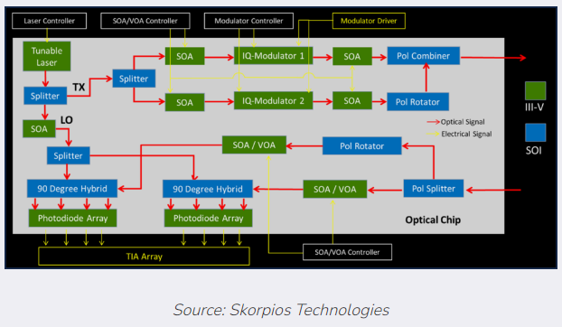 Skorpios(https://www.skorpiosinc.com/)是一家美國初創(chuàng)公司,開發(fā)了一種將其他材料制成的光學(xué)組件直接集成到硅電路——特別是可以調(diào)制光信號的硅光子電路——中的方法。該公司通過在硅中精確位置刻蝕凹坑來實現(xiàn)這一點,使得InP激光器芯片和其他光學(xué)組件可以在無需人工干預(yù)的情況下放入。Skorpios將其工藝瞄準(zhǔn)數(shù)據(jù)中心和相干光學(xué)市場,并已列出多種量產(chǎn)的數(shù)據(jù)中心模塊和相干PIC。