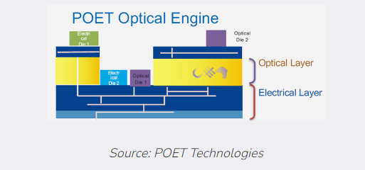 POET(https://poet-technologies.com/)開發(fā)了一種光學(xué)中介層,該中介層與標(biāo)準(zhǔn)制造技術(shù)集成,簡化了光學(xué)和電氣組件在晶圓層面的集成。采用POET技術(shù),電氣器件仍在硅晶圓上互連,而光學(xué)器件則通過構(gòu)建在硅頂層的波導(dǎo)進(jìn)行互連。其目的是制造非常緊湊、完全集成的器件,在晶圓級別組合所有組件,而無需在后期進(jìn)行放置和互連。