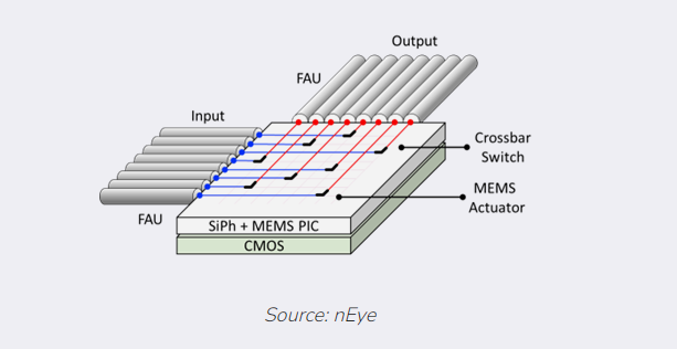 nEye(https://www.neye.ai/)是一家源自加州大學(xué)伯克利分校Ming Wu教授實驗室的早期初創(chuàng)公司,成立于2020年。nEye正在開發(fā)使用基于硅光子學(xué)中微機(jī)電系統(tǒng)(MEMS)交叉開關(guān)的PIC進(jìn)行光子交換。公司認(rèn)為其優(yōu)勢在于PIC的尺寸非常小、成本低、可靠性高、延遲低和交換速度快。