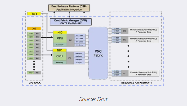 Drut(https://drut.io/)正在開發(fā)一個支持AI節(jié)點資源虛擬化解耦(virtual disaggregation)的平臺,包括完整的軟件棧、PCIe接口卡以及基于MEMS的光電路交換機(jī)。該組合允許內(nèi)存和存儲等資源池化,并按需動態(tài)共享。
