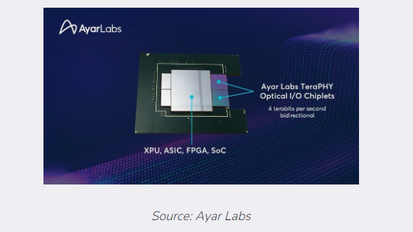 Ayar的首款產(chǎn)品TeraPHY芯片通過八個256Gbps硅光引擎,在封裝內(nèi)實現(xiàn)2Tbps帶寬,專為與交換機(jī)、GPU或其他處理器并排集成而設(shè)計。將光引擎與處理器共置可實現(xiàn)比傳統(tǒng)銅纜或可插拔光模塊更低的功耗、更低的延遲以及在更高速率下的更優(yōu)性能——這也是眾多公司競相布局該領(lǐng)域的原因。CPO和LPO等方案也瞄準(zhǔn)這一應(yīng)用場景,但Ayar(及其他公司)的方案旨在將光學(xué)器件直接集成到處理器基板或多芯片模塊(MCM)上,更側(cè)重于AI節(jié)點內(nèi)部而非節(jié)點間的連接。