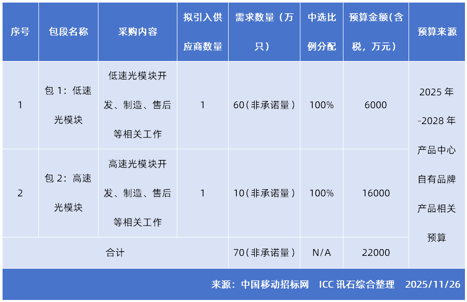 ICC訊 2025年11月25日,中國移動與招標(biāo)網(wǎng)于采購網(wǎng)發(fā)布《終端公司2025年自有品牌光傳輸器件制造服務(wù)項目》詢比公告。據(jù)悉,項目資金由采購人自籌,資金已落實,已具備采購條件,現(xiàn)進(jìn)行公開詢比。