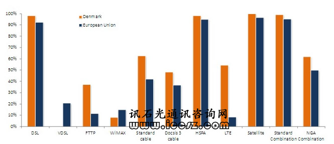 《2011歐洲寬帶覆蓋》調(diào)研報告顯示,丹麥99%的家庭能夠使用基本的寬帶,也就是說,只要他們想用,就可以獲得至少144kbps。大概62%能夠使用超高速寬帶(也成為NGA,即下一代接入)。在調(diào)研的29個國家中(歐盟27國和挪威、冰島),96%能夠獲得基本寬帶,超過50%(一半國家走向2020數(shù)字天堂目標(biāo))能夠獲得超高速。