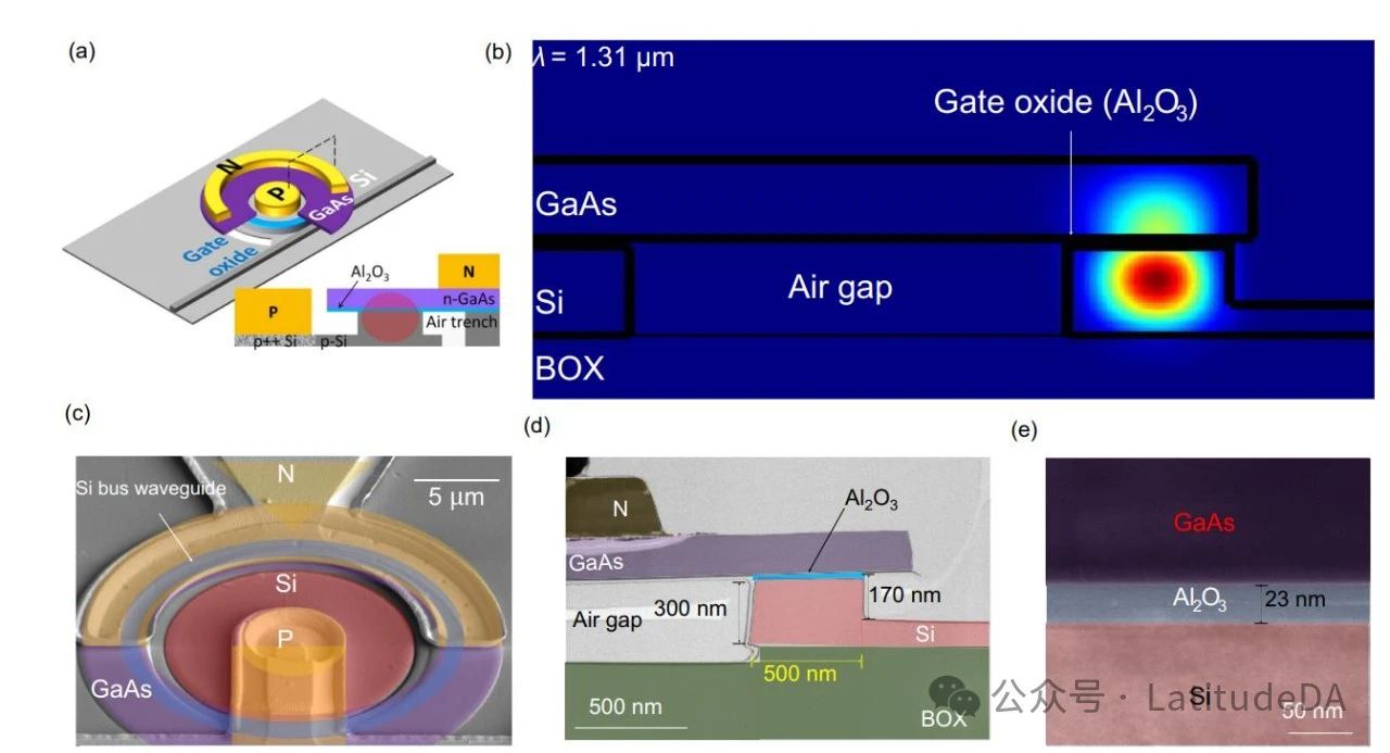 圖 1 | 設(shè)備結(jié)構(gòu)與圖像展示。a 展示了一個在硅基底上集成 III–V 材料的微環(huán)諧振器的三維及剖面視圖。b 描述了在 1310 納米波長下,微環(huán)波導(dǎo)內(nèi)基礎(chǔ)橫電模式的場強度模擬情況。c 為 memresonator 的掃描電鏡橫切面圖像,呈現(xiàn)出其內(nèi)部結(jié)構(gòu)。d 是 memresonator 通過透射電鏡拍攝的橫截面圖像,展示了更細致的內(nèi)部結(jié)構(gòu)。e 則是一塊結(jié)合了 GaAs、Al2O3 和 Si 的記憶體的透射電鏡圖像,顯示了其復(fù)合材料的結(jié)構(gòu)細節(jié) [1]。