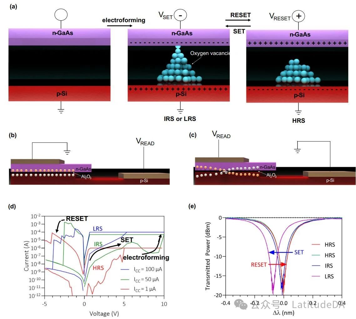 圖 2 | 展示了器件的工作原理和關(guān)鍵特性。a 這是一個示意圖,展示了在 memristor 內(nèi)部如何形成和斷裂導(dǎo)電細絲(CFs)。VSET 指的是設(shè)置 memristor 為內(nèi)部低阻態(tài)(IRS)或低阻態(tài)(LRS)所需的電壓。VRESET 是重置 memristor 為高阻態(tài)(HRS)所用的電壓。b 在高阻態(tài)時,給 memristor 施加讀取電壓(VREAD)后,波導(dǎo)內(nèi)部載流子的分布示意圖。c 在內(nèi)部低阻態(tài)或低阻態(tài)時,施加讀取電壓后波導(dǎo)內(nèi)載流子的分布圖。d 是設(shè)備的電流-電壓曲線圖,顯示了 memristor 典型的滯后現(xiàn)象。為了調(diào)整設(shè)備到不同的電阻狀態(tài),正向偏置電壓下分別采用了1 μA、50 μA 和 100 μA 的電流限制。e 展示了在施加2V讀取電壓時,memresonator 在不同狀態(tài)下的光譜特性 [1]。