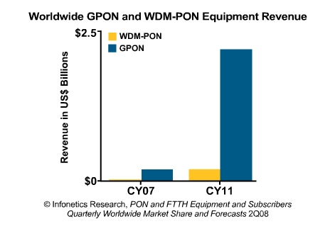 從2008年第一季度到第二季度,全球BPON制造商收入增長了25%,端口出貨量增長52%。全球BPON、EPON和GPON用戶預計在2011年能達到4600萬。