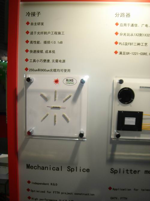 日海通訊設(shè)備有限公司在本次世界電信展上展出了產(chǎn)品光纖冷接子和分路器,其中冷接子由日海自主研發(fā),適于光纖到戶工程,插入損耗≤0.1dB,小巧便捷、無需電源,250um和900um光纜均可使用。