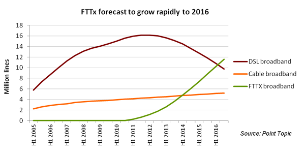 Point Topic首席分析師 Tim Johnson指出,“這仍然是一個(gè)充滿(mǎn)風(fēng)險(xiǎn)和矛盾的預(yù)測(cè),因?yàn)閷?duì)于這樣增長(zhǎng)如此快速事物的預(yù)測(cè)往往是非常困難的。如果預(yù)計(jì)正確的話(huà),超速寬帶用戶(hù)數(shù)從2011年中期到2016年末增長(zhǎng)了50倍。”之所以說(shuō)是矛盾的預(yù)測(cè)是因?yàn)榧夹g(shù)和市場(chǎng)的雙重不確定性。BT是在這方面起步較晚,其超快的技術(shù)將主要是光纖到柜(FTTC),這意味著鋪設(shè)新的光纖FTTC,然后提供基于最后幾百米的普通電話(huà)線的短距離但高速的數(shù)字技術(shù)。Telcos在歐洲和英國(guó)部署FTTC這一技術(shù)已經(jīng)很多年了,該公司也發(fā)現(xiàn)了推出這一寬帶,并且有效連接客戶(hù)的難度。