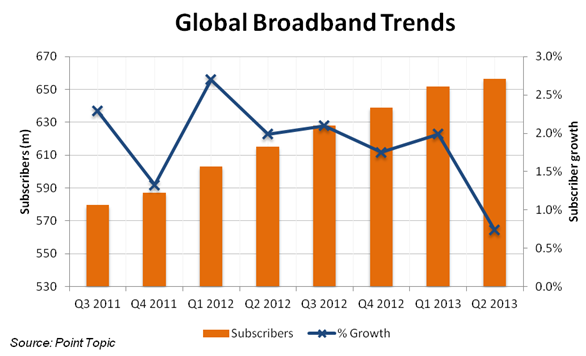 ICCSZ訊(編譯:Nina)來(lái)自Point Topic的數(shù)據(jù)顯示,截止2013年6月,全球固網(wǎng)寬帶用戶數(shù)達(dá)到6.565億,相比上個(gè)季度末增長(zhǎng)了0.7%,這是自1998年以來(lái)最小的季度增幅。