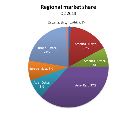 從區(qū)域市場(chǎng)來(lái)看,不同地區(qū)的寬帶用戶數(shù)有顯著變化。相比Q113而言,所有區(qū)域的增速都有所放緩,不過(guò)放緩最大的是東南亞地區(qū)(主要是中國(guó)市場(chǎng))。東南亞地區(qū)擁有全球最多的固網(wǎng)寬帶用戶,因此該區(qū)域市場(chǎng)增速放緩對(duì)全球市場(chǎng)的增速有著顯著影響。