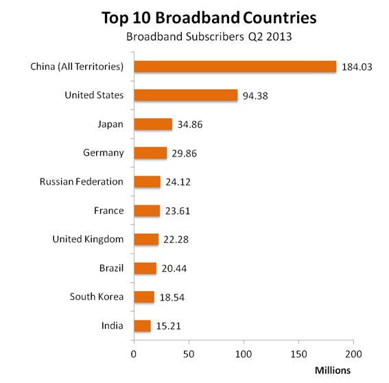 Q213的全球十大寬帶用戶國(guó)排名跟Q113相比沒(méi)有變化。中國(guó)的寬帶用戶總數(shù)比美國(guó)、日本、德國(guó)和俄羅斯加起來(lái)的總數(shù)還大。