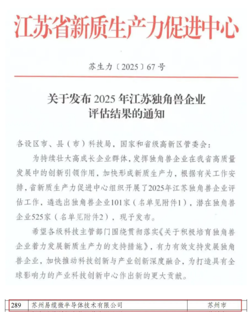 2025年9月24日,江蘇省新質生產力促進中心組織召開了“2025年江蘇獨角獸企業(yè)和瞪羚企業(yè)評估結果發(fā)布會”。入圍2025年江蘇獨角獸企業(yè)101家、潛在獨角獸企業(yè)525家、瞪羚企業(yè)1516家。易纜微繼獲評2024年蘇州市“獨角獸”培育企業(yè)之后,今年成功晉級為江蘇省“潛在獨角獸”企業(yè)。