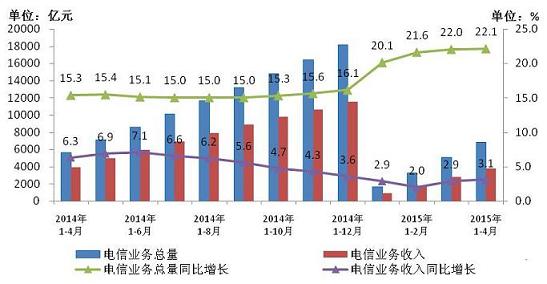 2015年4月份,我國(guó)三家基礎(chǔ)電信企業(yè)運(yùn)行穩(wěn)中趨緩,收入增長(zhǎng)小幅回升。